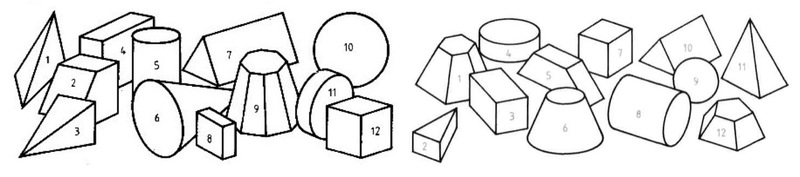 Действия преподавателя: Предлагает чертеж, на котором изображено 12 геометрических тел