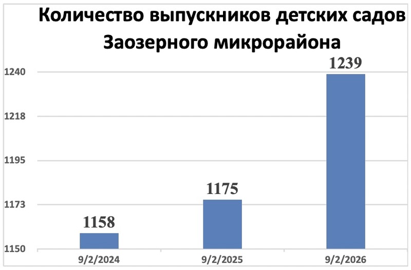 Этот факт вполне объясним: в пос. Заозерный последние годы активно ведется застройка новых жилых комплексов. Во 2 микрорайоне – «Мостовик», в 3 микрорайоне – «Пифагор», «Геометрия», в 5 микрорайоне – «Три богатыря», «Апельсин», «Снегири», в 7 микрорайоне – «Первомайский», «Акварели», в 4 микрорайоне – «Эверест», «Семейный», «Сказка» и другие. Закладывается строительство новых микрорайонов – 16 микрорайон (ЖК «ZAозерный»), 15 микрорайон (ЖК «Европа»), 12 микрорайон (ЖК «город Сказка»), 11 микрорайон (ЖК «Родные просторы»), 8 микрорайон (ЖК «Театральный»). В эти микрорайоны заезжают жить в основном молодые семьи с маленькими детьми. Потребность в детских садах существует у жителей Заозерного микрорайона. За последние три года в Заозерном микрорайоне построено 2 новых детских сада и 5 пристроенных ясельных корпусов (введено 1110 мест новых мест для дошкольников). А вот за последние 30 лет не было построено ни одной новой школы в Заозерном микрорайоне.
