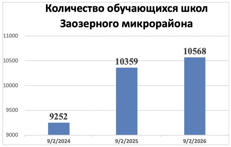 Анализ обработанных данных показал, что количество выпускников в детских садах выросло в Заозерном за последние три года на 81 человека, а количество обучающихся в школах Заозерного микрорайона за последние три года увеличилось на 1316 обучающихся. По состоянию на 1 сентября 2022 года количество обучающихся в МБОУ «СОШ №5» и МБОУ «СОШ №56» уже превышает количество обучающихся, предусмотренное проектной наполняемостью в две смены. А в одну смену, как это планировалось в Программе «Содействие созданию в субъектах Российской Федерации (исходя из прогнозируемой потребности) новых мест в общеобразовательных организациях» на 2015-2025 годы», не получается обучаться во всех шести школах Заозерного микрорайона.